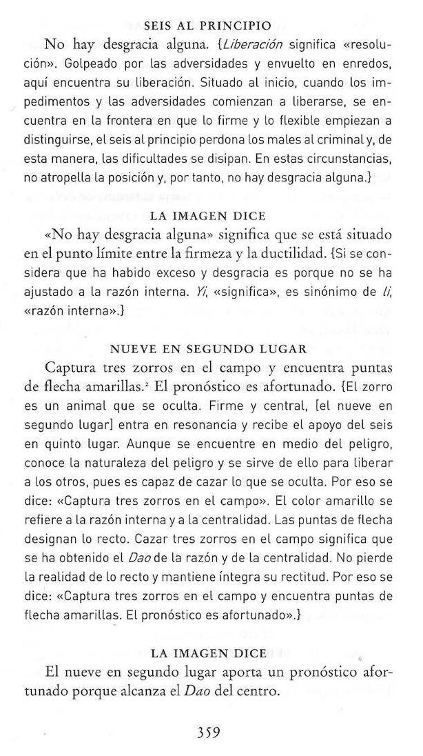No hice una lectura detallada de todo el libro, sino que consulté los textos de distintos hexagramas, un poco al azar, por lo que sospecho que debe de haber otros errores que no he descubierto. Todo indica que el libro no fue revisado propiamente antes de ser publicado, a pesar de que yo tengo la cuarta edición, de 2019, lo que les dio 13 años para corregir los errores de la primera edición. Esto es una pena porque esta traducción es la segunda, en orden de importancia y calidad, después de la de Wilhelm/Vogelmann, en el idioma español. Además se nota que los autores conocen el tema, y aportan el comentario de Wang Bi, lo que nos brinda nuevas perspectivas sobre la interpretación del texto. Debido a la importancia de esta traducción me sorprende e irrita que hayan descuidado tantos detalles y se hayan tomado ciertas libertades anacronísticas en la traducción. Este YiJing es como un auto de lujo, en el que uno no esperaría encontrar defectos que serían comunes en vehículos económicos.