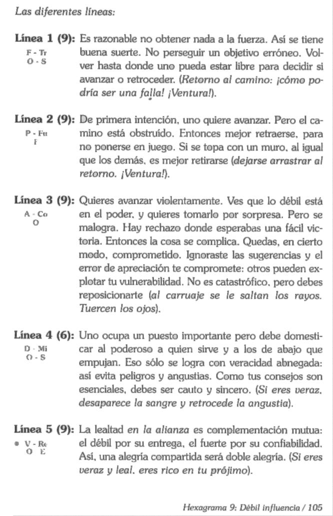 Como en el ejemplo muta una sola línea, esto es apropiado. Pero cuanto mutan varias líneas, el método tradicional es otro; esas líneas no se leen en el hexagrama mutado, sino que cada una de ella se muta, una a una, para obtener los distintos hexagramas vinculados a las diferentes líneas mutantes. Para aclarar esto yo también pondré un ejemplo, si obtenemos el hexagrama 1, Lo Creativo, cuyas tres primeras líneas (1, 2 y 3) mutan, obtendríamos el hexagrama 12, El Estancamiento, como hexagrama mutado, pero allí no consultaríamos ninguna línea, sino que, mutando las tres primeras líneas del hexagrama inicial, una a una, obtendríamos otros tres hexagramas: 44, El Ir al Encuentro, 14, La Posesión de lo Grande y 10, El Porte. En cada uno de esos tres hexagramas deberíamos leer la primera, segunda y tercer línea, respectivamente, para aclarar el significado de la primera, segunda y tercer línea del hexagrama inicial, Lo Creativo.
